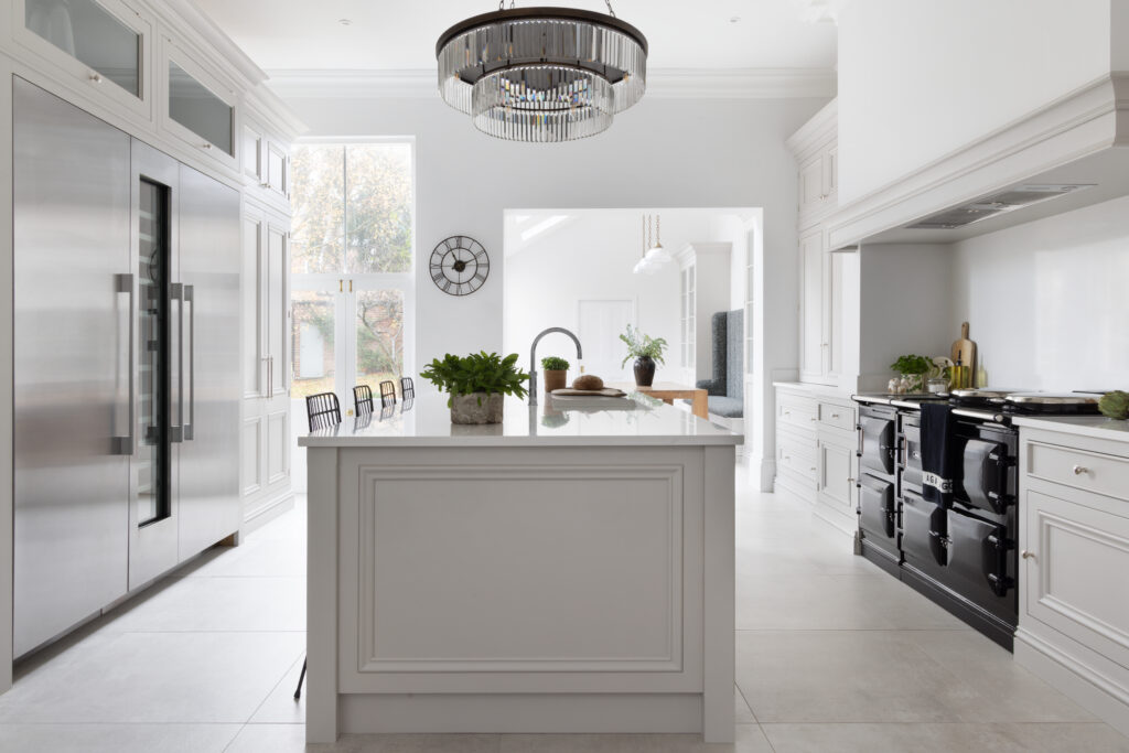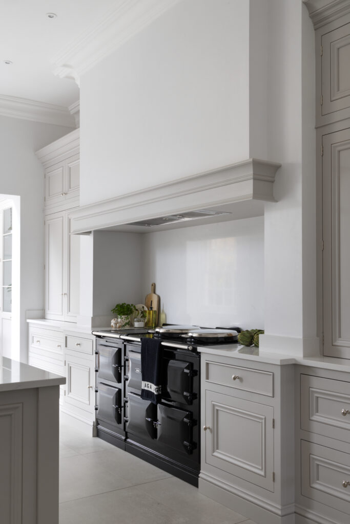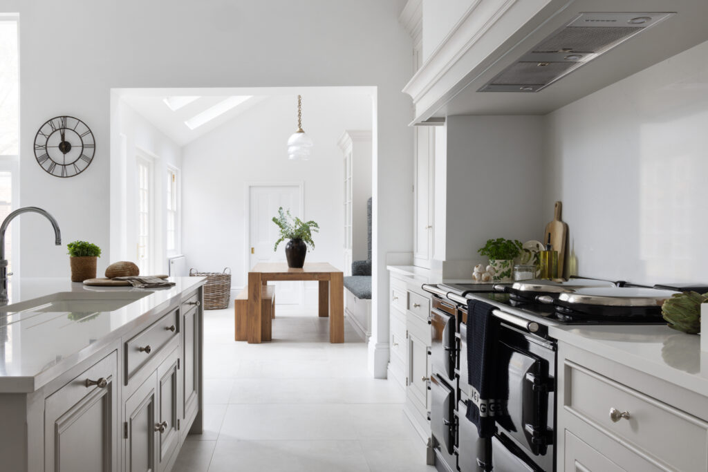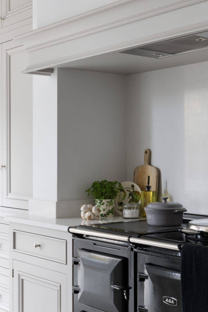 You can’t ignore the black Aga. We set it into a dedicated chimney niche to give it presence. It’s a heavy, serious piece of kit that contrasts perfectly with the soft Farrow & Ball Cornforth White cabinetry. We paired it with polished nickel hardware – classic, solid, and timeless.