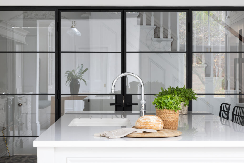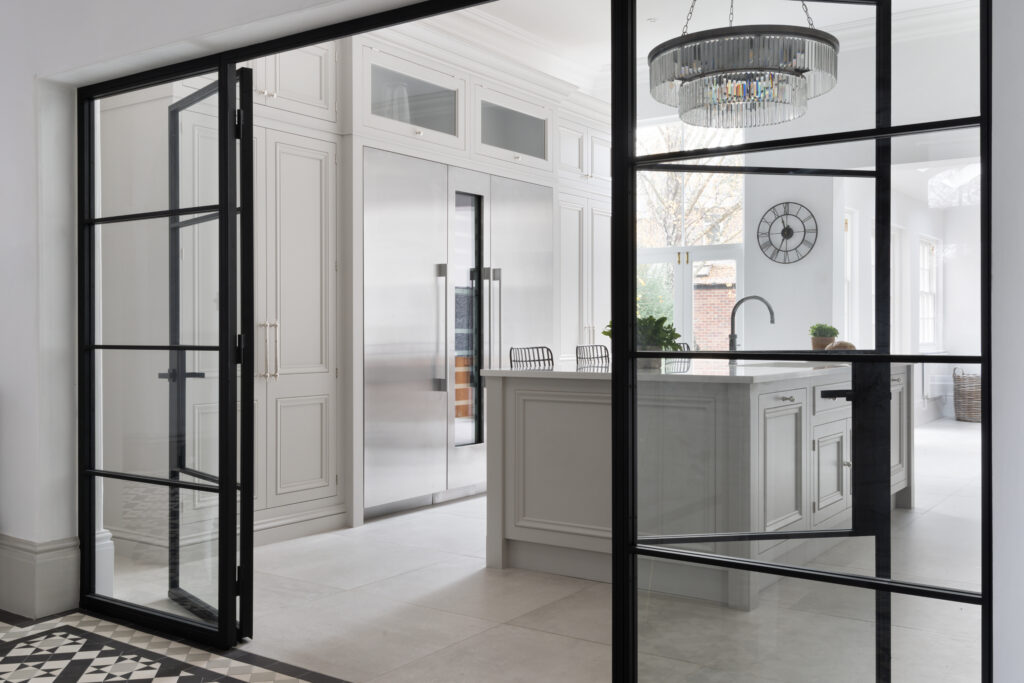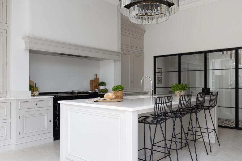 To stop the room from feeling too “cottage”, the client introduced black steel-framed glazed doors. These Crittall-style partitions add a contemporary, industrial texture that talks to the black Aga and the wire-frame bar stools.