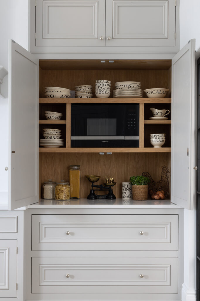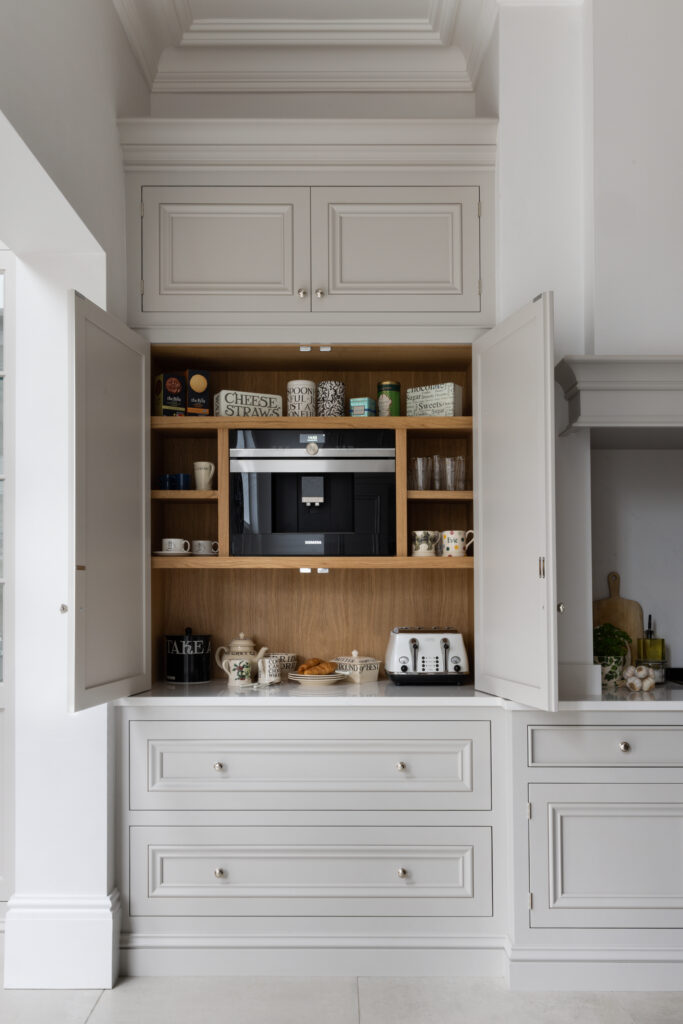 Storage was non-negotiable. We installed a double pantry that swallows the weekly shop whole. Then there’s the hidden breakfast bar. Behind the doors sits the coffee machine, toaster, and the morning mess. You make your coffee, close the doors, and suddenly your kitchen looks pristine again.