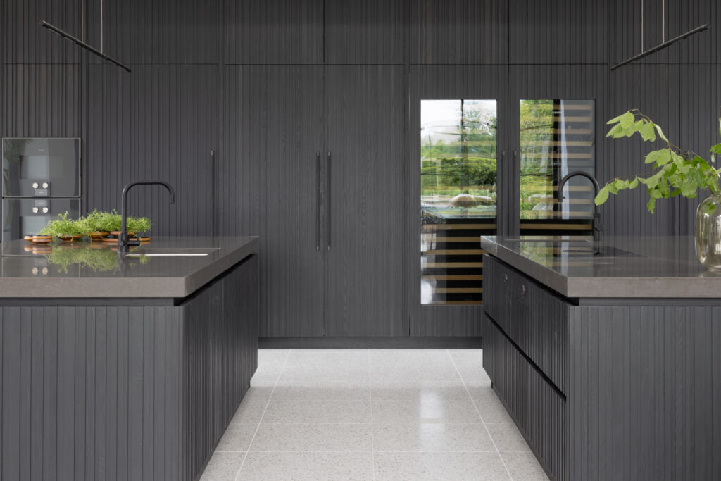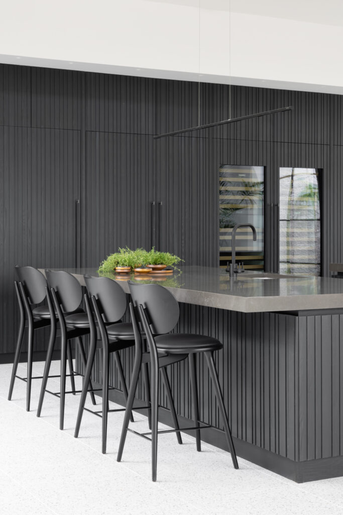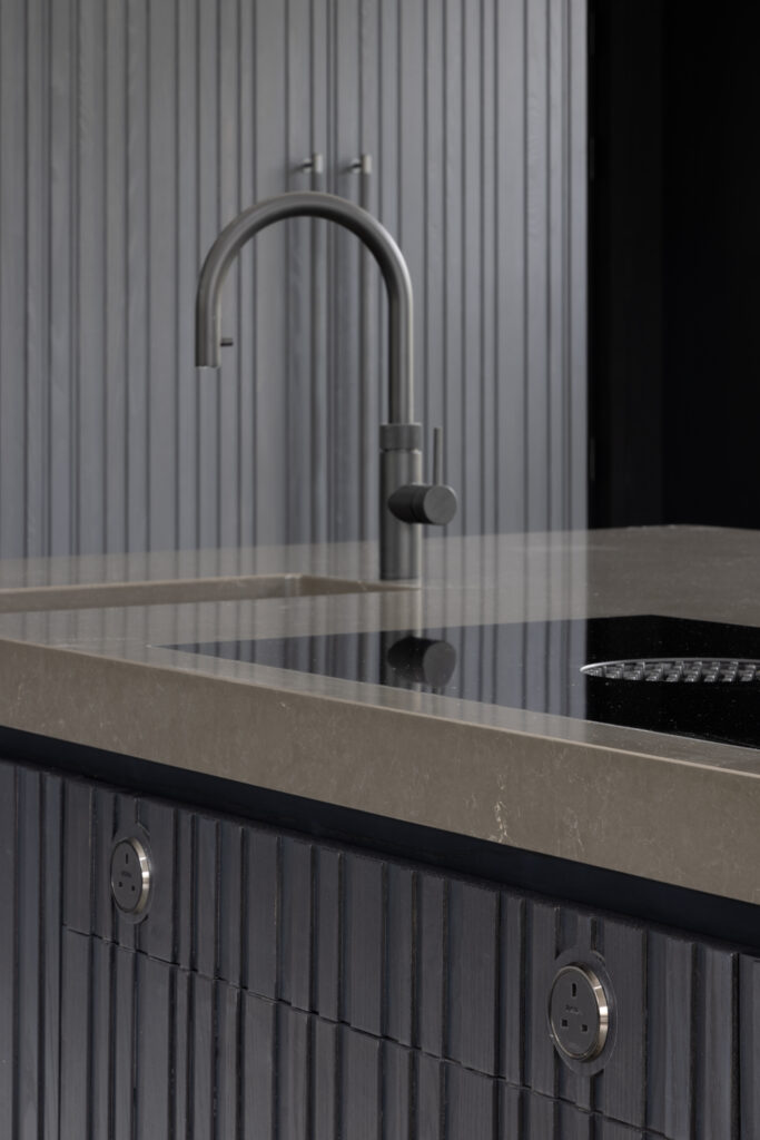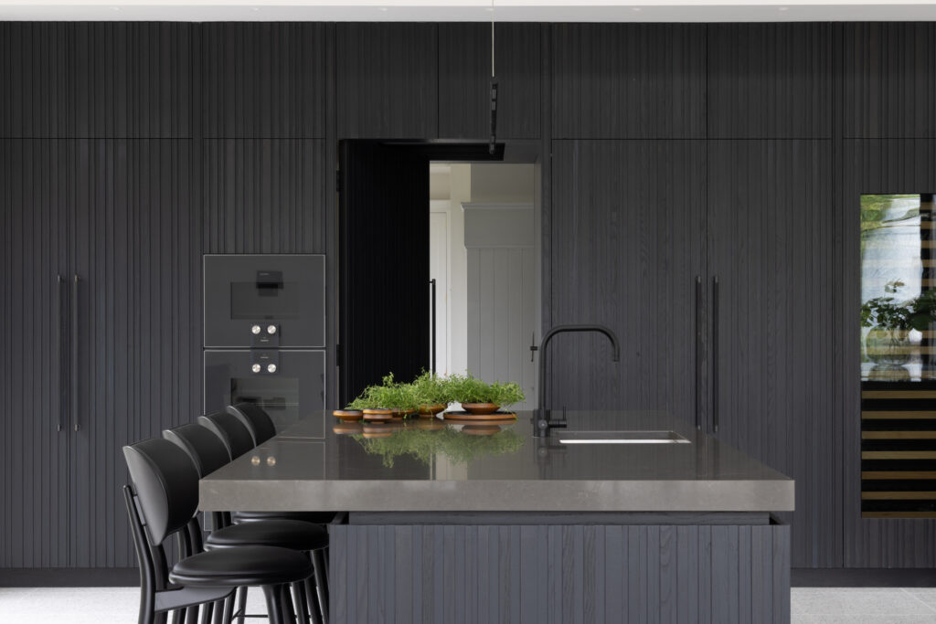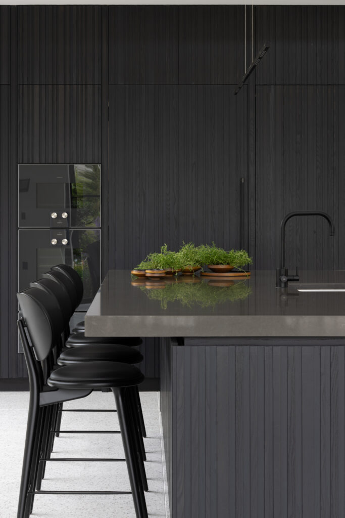 We went dark for this one. The cabinetry is crafted from slatted, stained ash. The thousands of tiny slats catch the light and stop the black finish from looking flat. We paired it with Clay Caesarstone, a thick, tactile surface that feels as substantial as it looks.