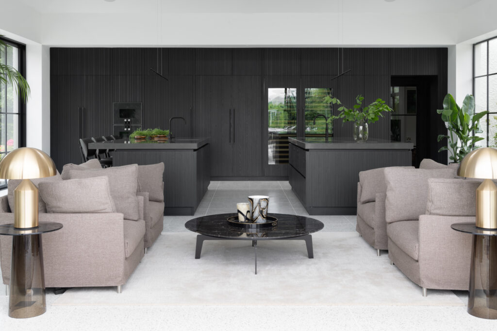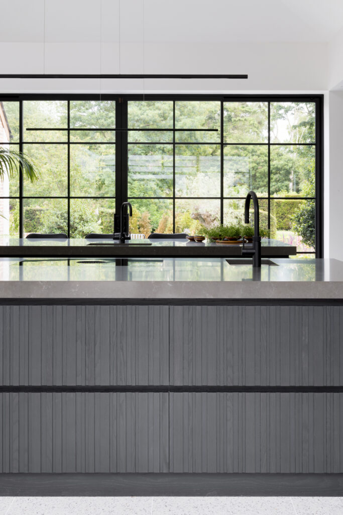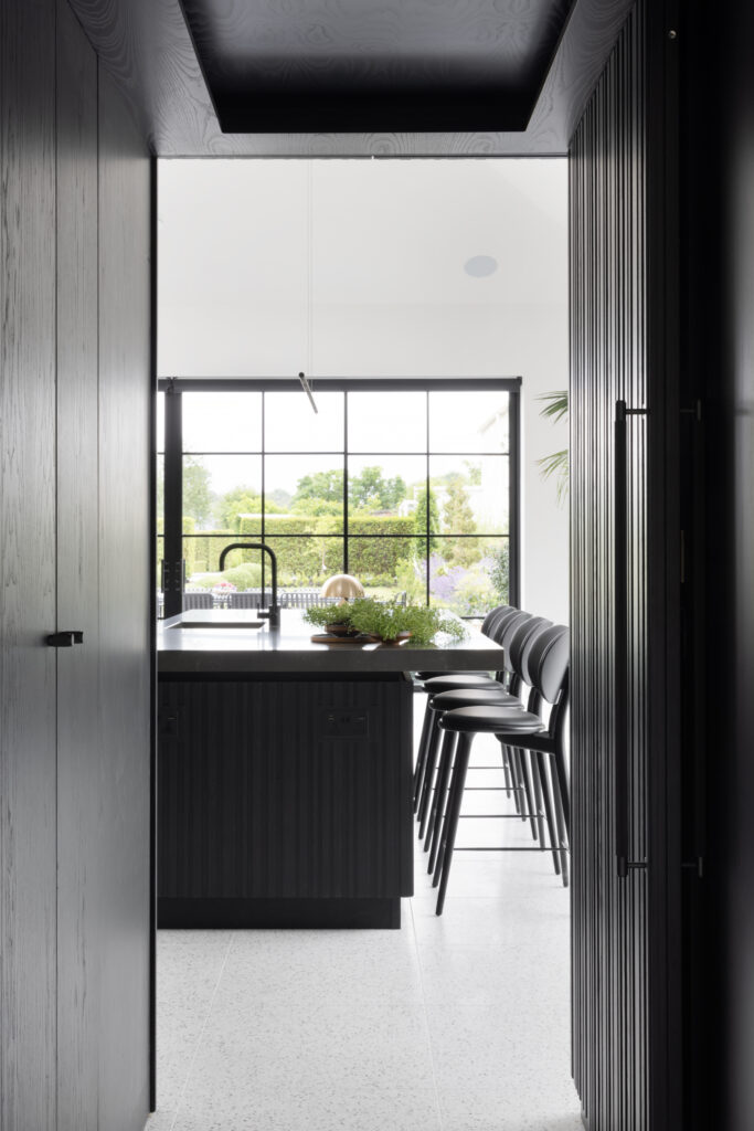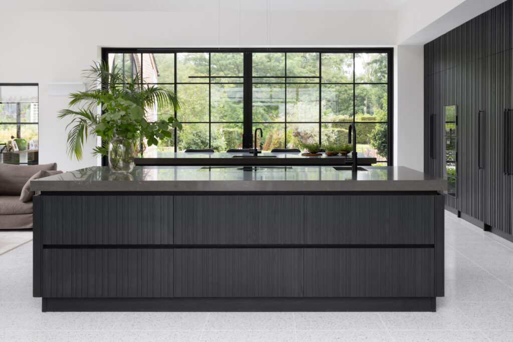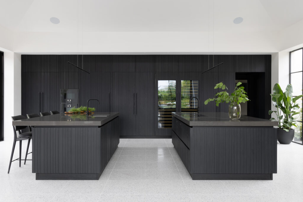 We went dark for this one. The cabinetry is crafted from slatted, stained ash. The thousands of tiny slats catch the light and stop the black finish from looking flat. We paired it with Clay Caesarstone, a thick, tactile surface that feels as substantial as it looks.