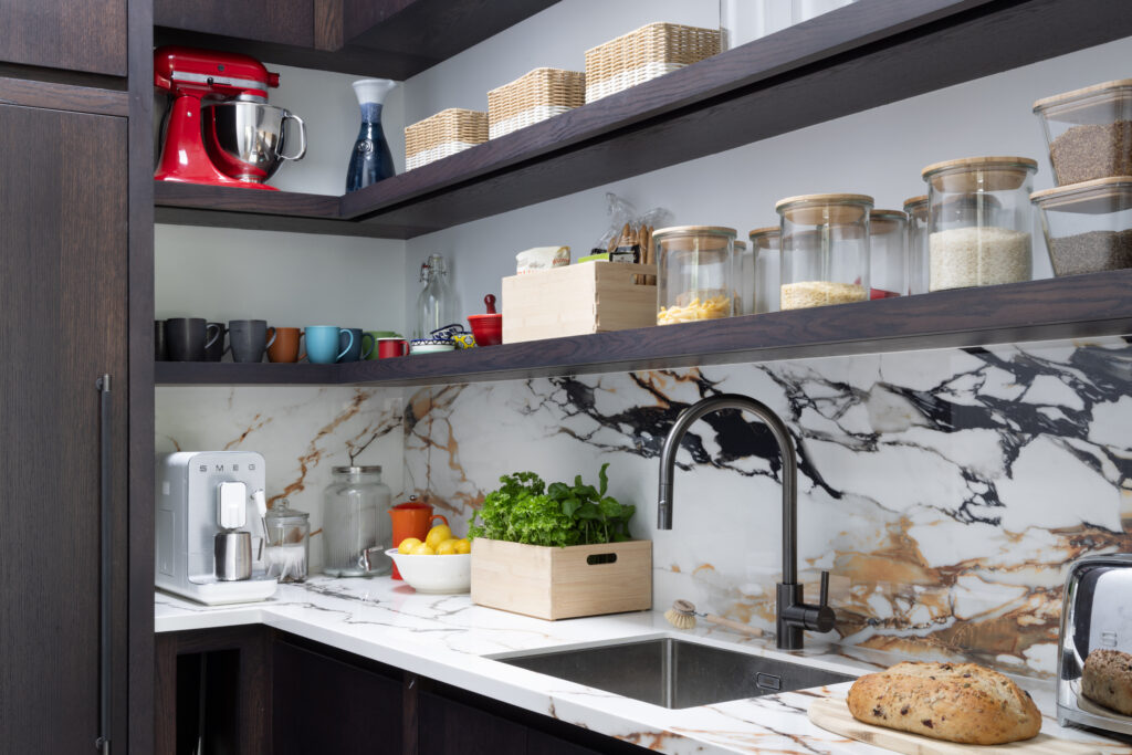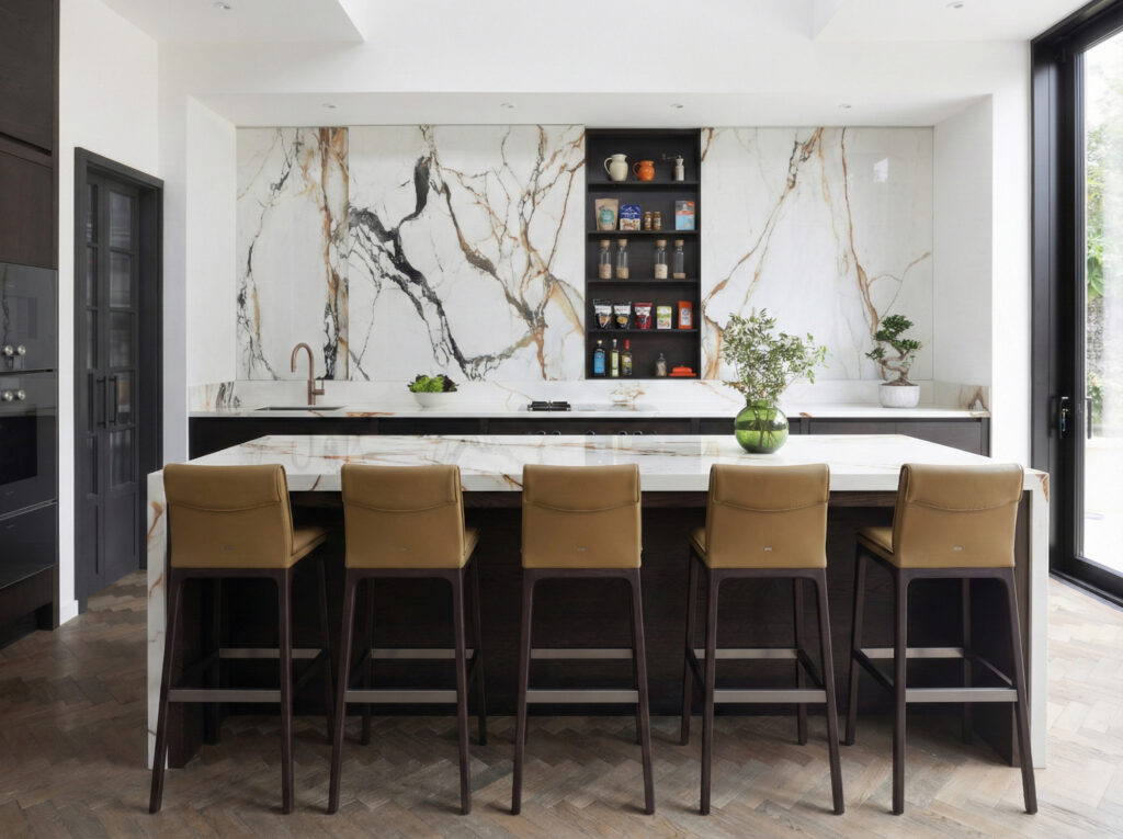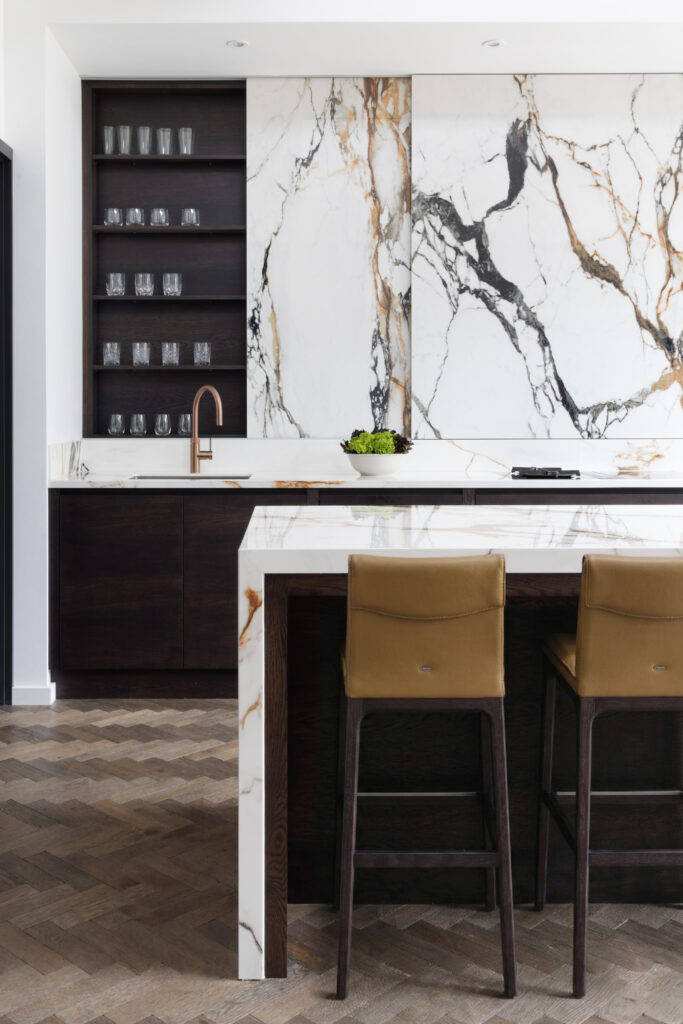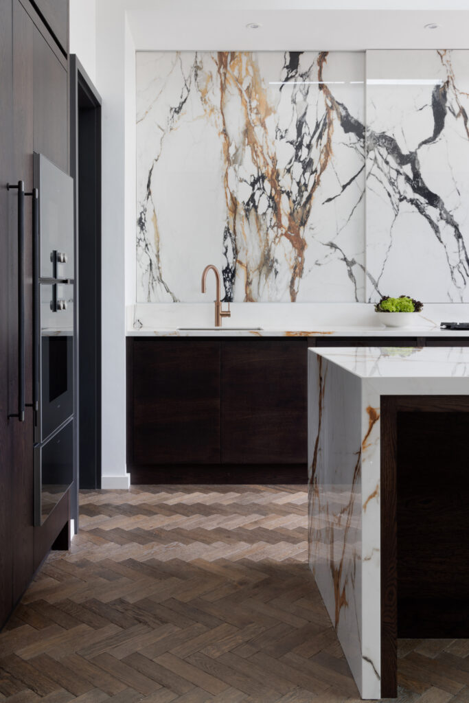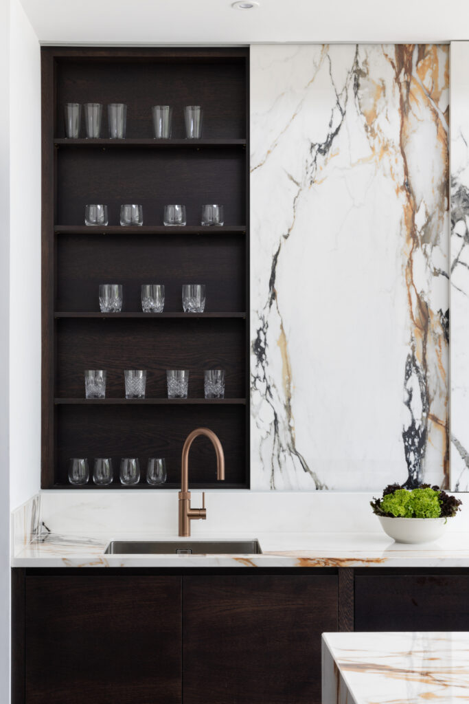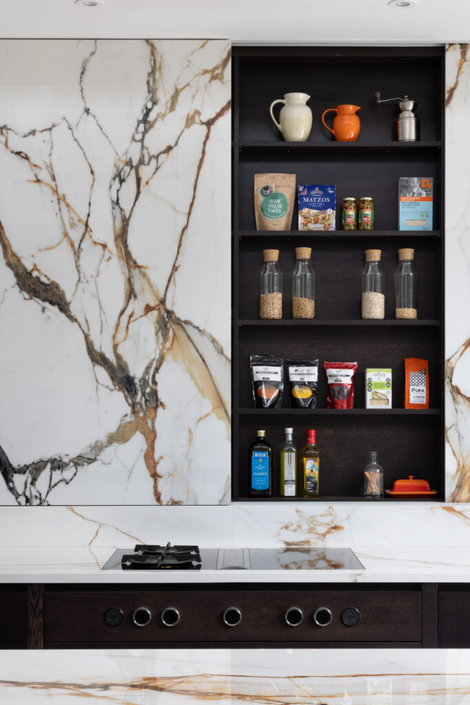 The back wall looks like a solid slab of X-Tone Paonazzo Biondo stone. It isn’t. We engineered colossal, five-foot-tall sliding doors clad entirely in the stone. Behind them sits shallow storage for spices and oils. The obsession is in the detail: we pattern-matched the veins across the seams so that when the doors are closed, the gold and grey lines flow uninterrupted. It’s heavy engineering disguised as art.