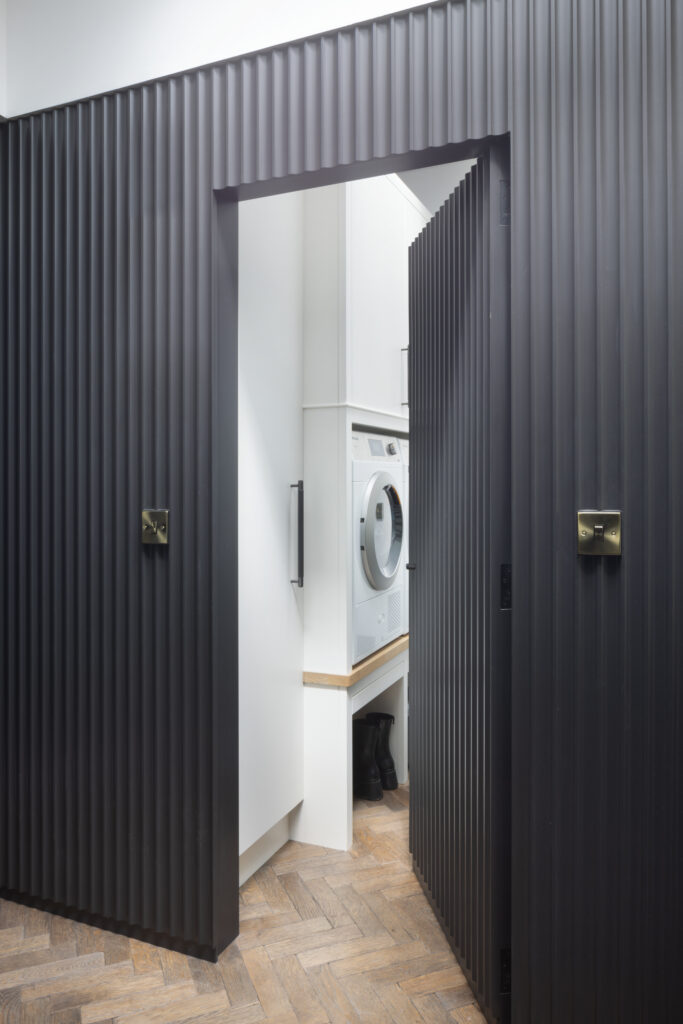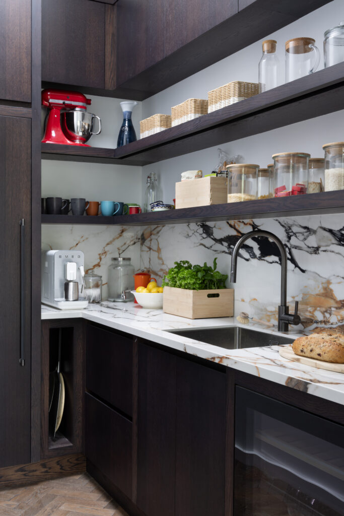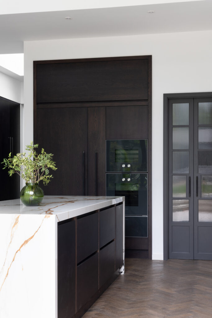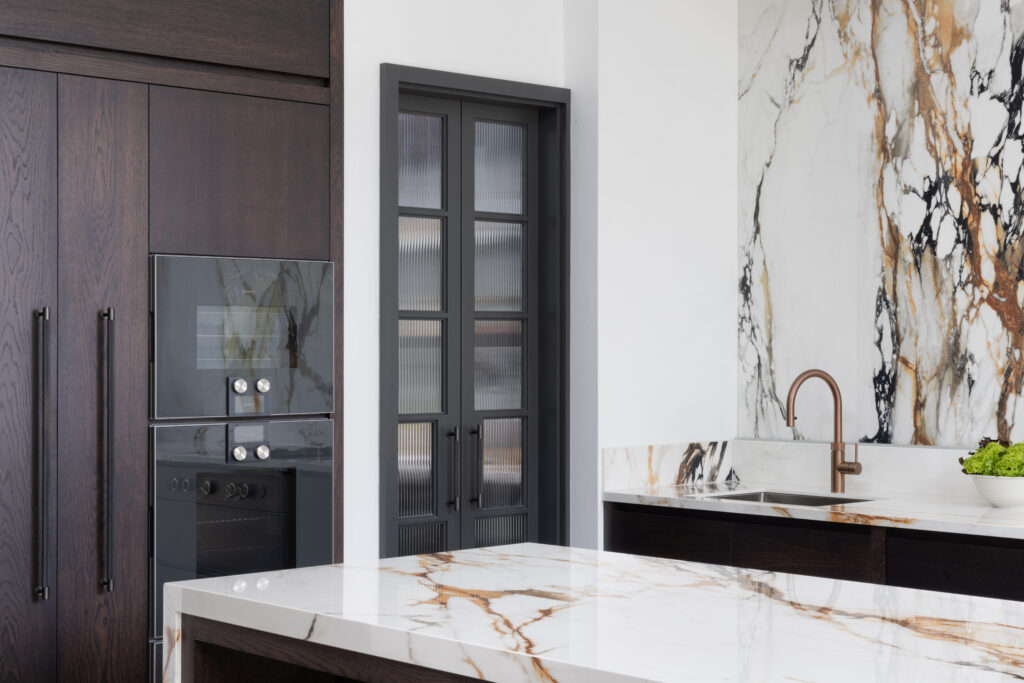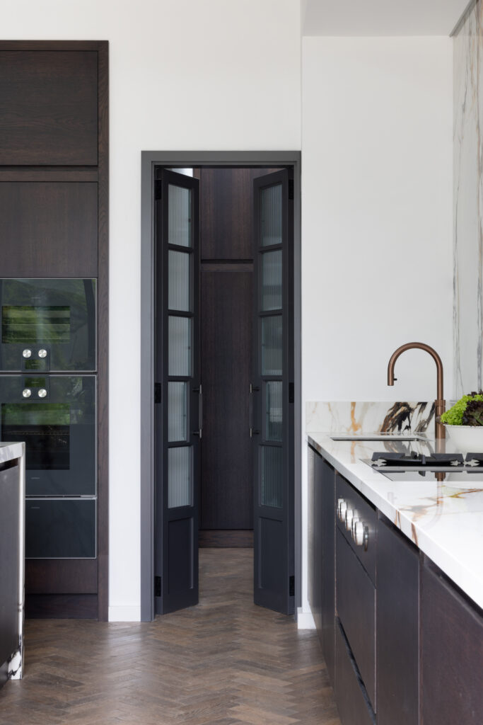 Minimalism looks great in photos, but it requires discipline to live with. To keep the main room pristine, we built a ‘kitchen within a kitchen’ hidden behind elegant, dark fluted glass doors. This intelligent secondary space houses the sink, freezer, and the messy reality of daily life, allowing the main kitchen to remain a total sanctuary. It proves that the secret to a pristine home isn’t cleaning more; it’s having a sophisticated ‘backstage’ area to manage life behind the scenes.