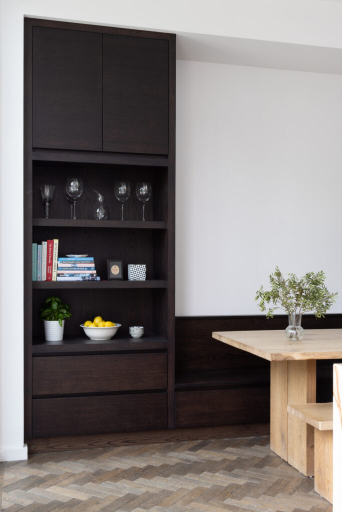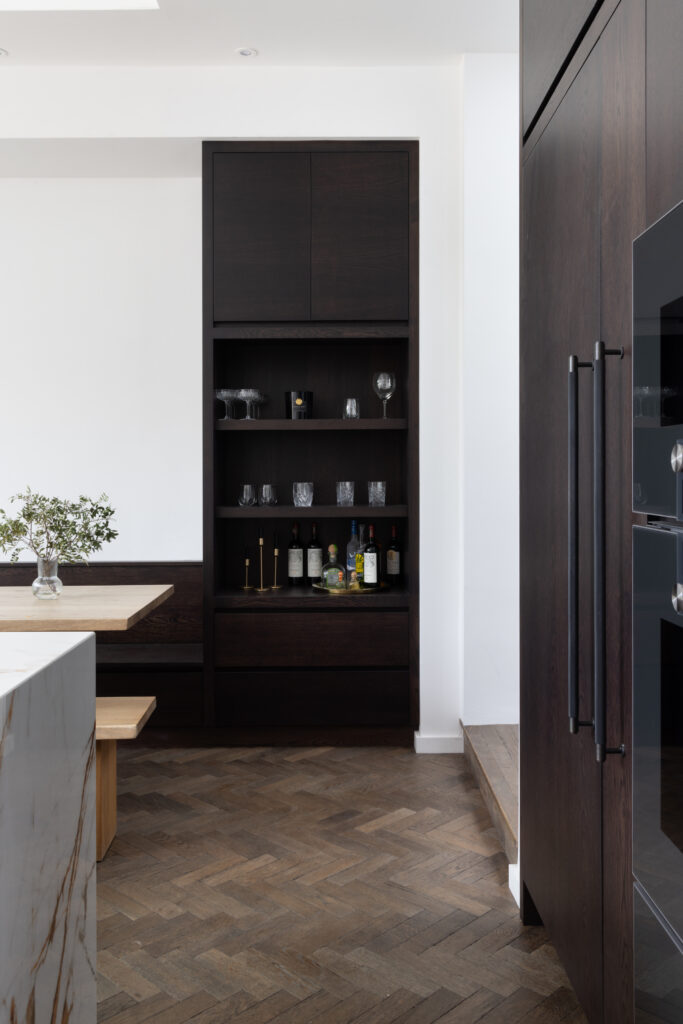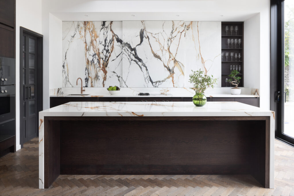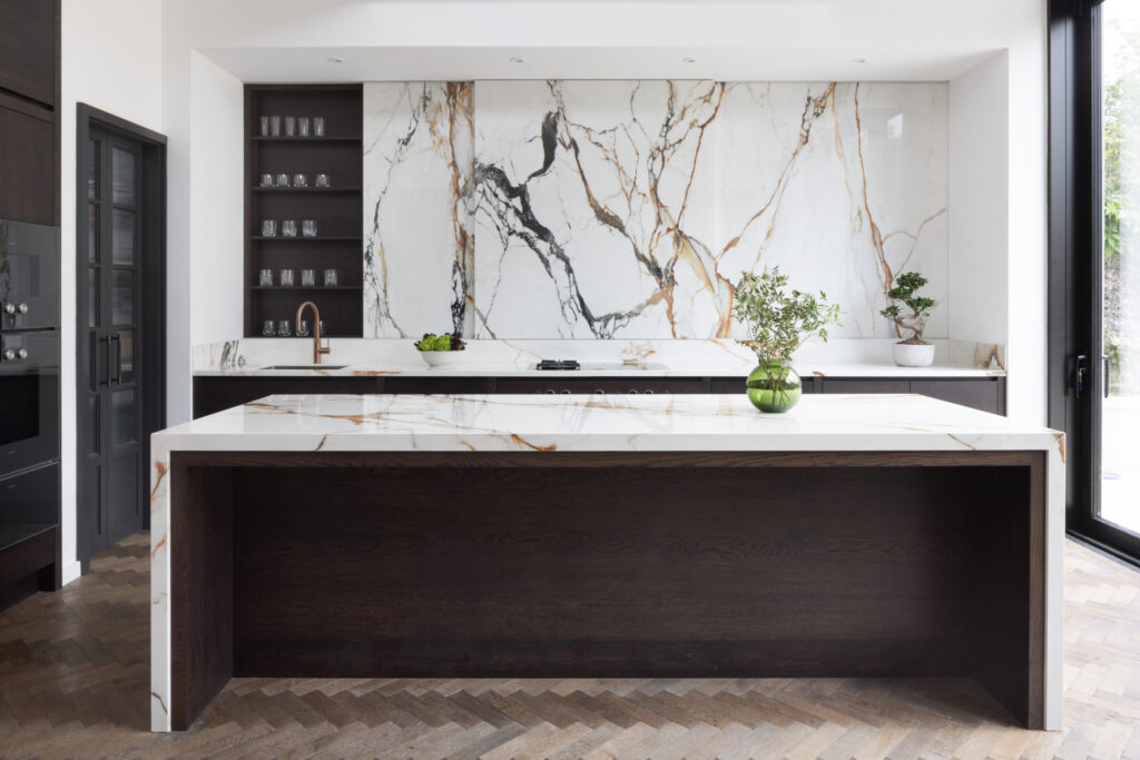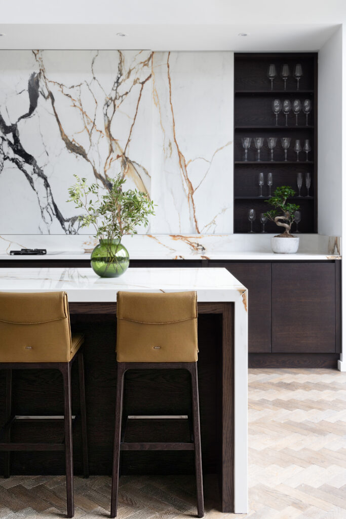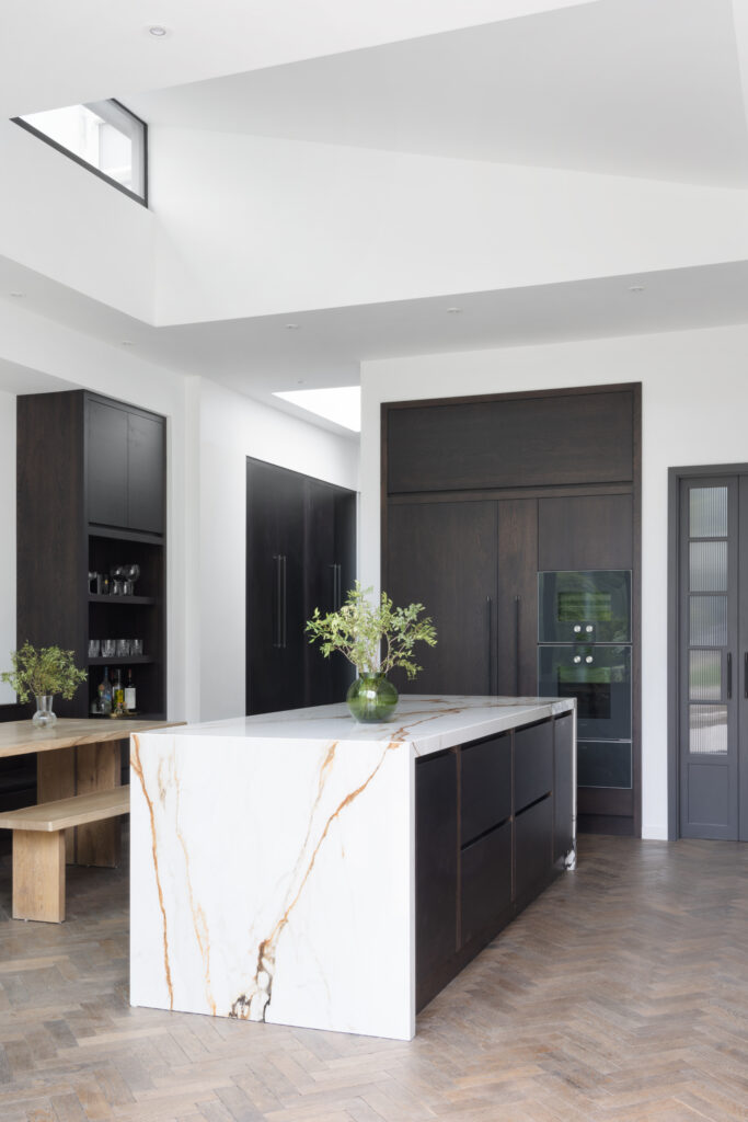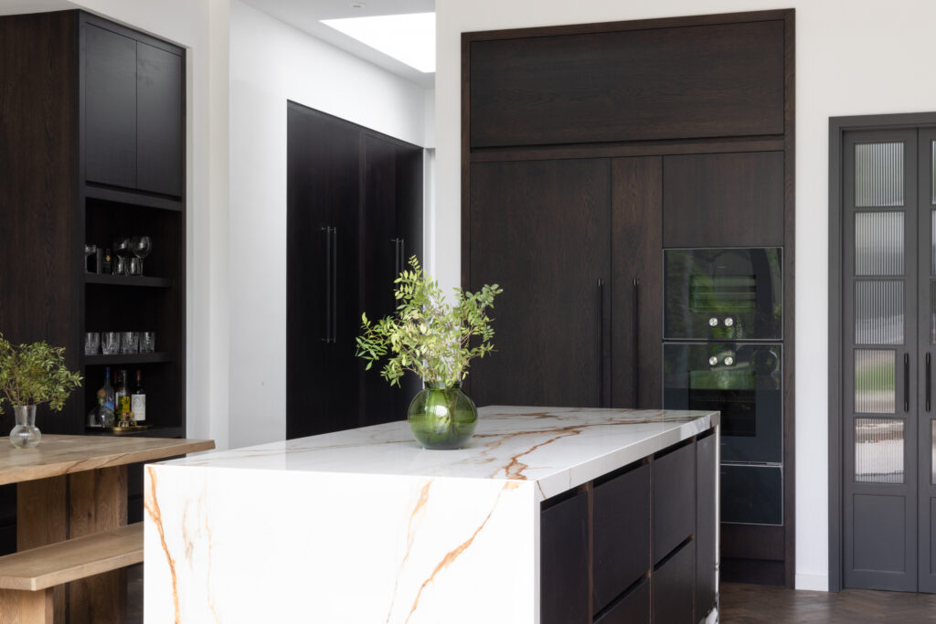 The island is designed as a singular, social statement. We kept the surface completely clear – no sinks, no hobs, no clutter – to allow the natural beauty of the stone to take centre stage. The functional theatre is reserved for the back wall, where a Bora Professional cooktop offers both gas and induction, set against a seamless backdrop of XTONE. To maintain these clean lines throughout, we even hid electrical sockets into the island’s front fascia. It’s a space designed for those who take cooking seriously, without ever compromising on the aesthetic.