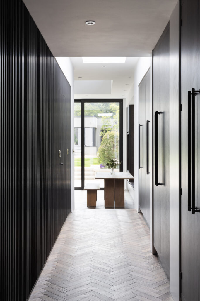 Minimalism continued down the long hallway of this townhouse. Custom panelling concealed a laundry room and snug.
