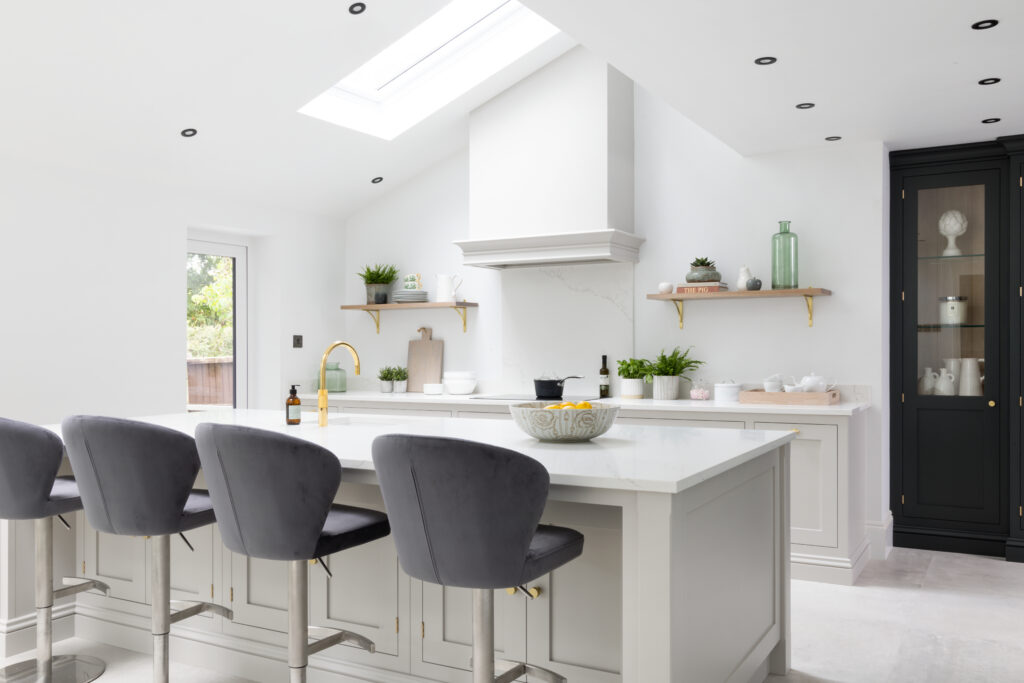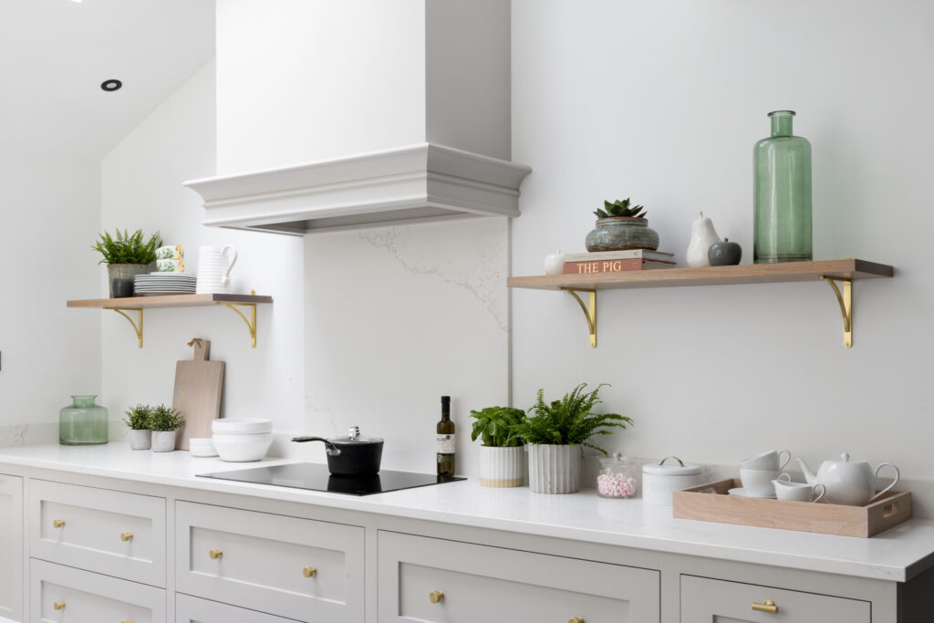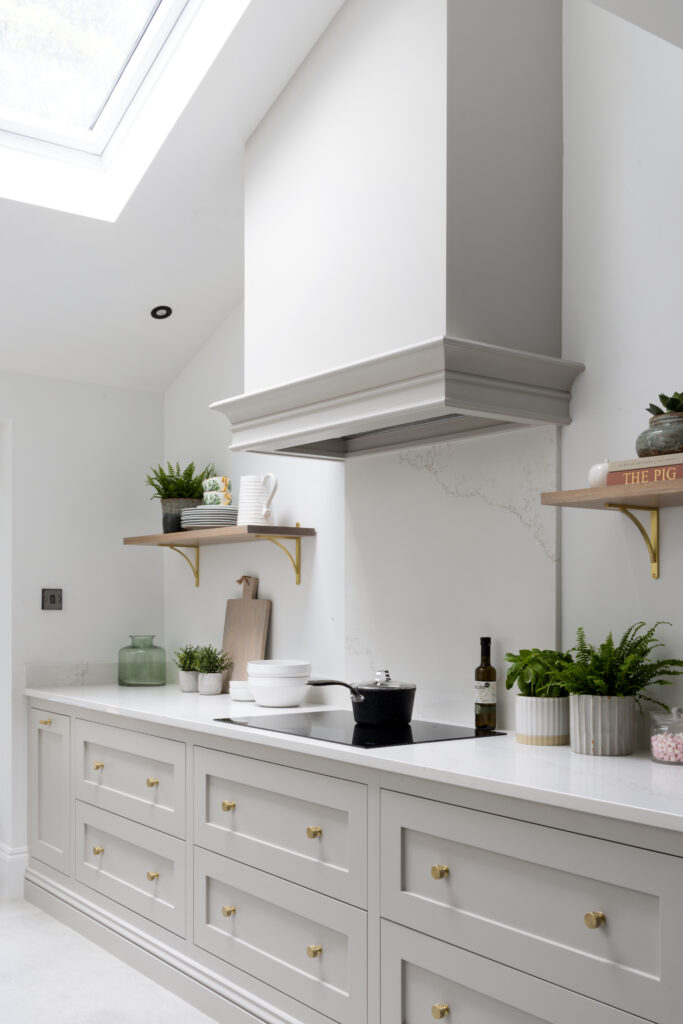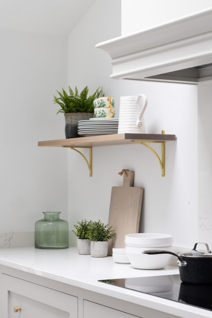 We knocked down partitions and found a vaulted ceiling hiding underneath. Suddenly, a dark room was flooded with light. To keep that airy feeling, we opted for floating shelves with brass brackets. It keeps sightlines clear (and forces you to keep your crockery tidy).