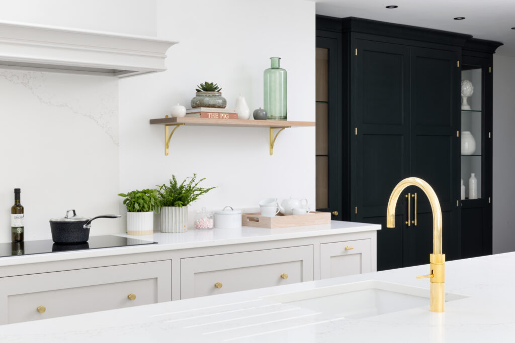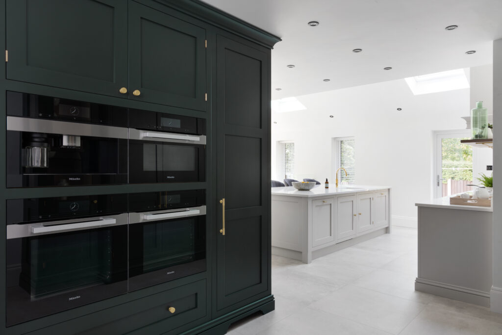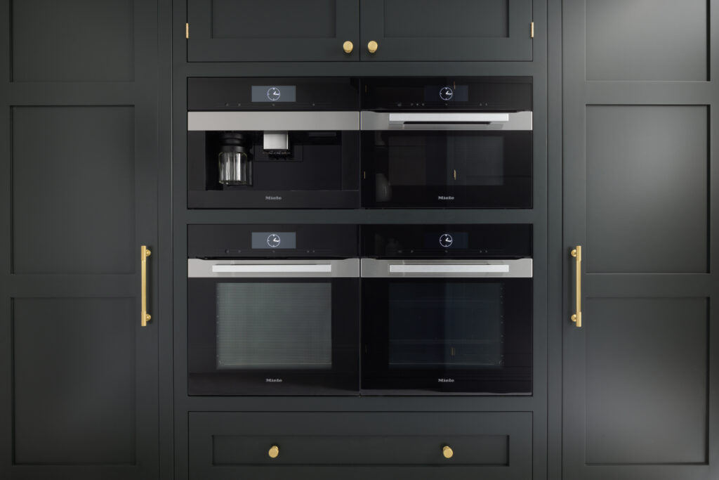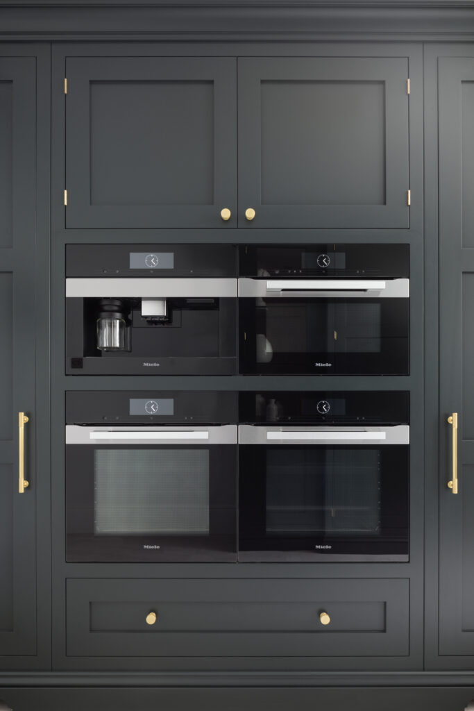 The dark cabinetry houses a bank of Miele ovens and full-height cooking. Not forgetting the all important coffee machine. It looks serious – because it is.