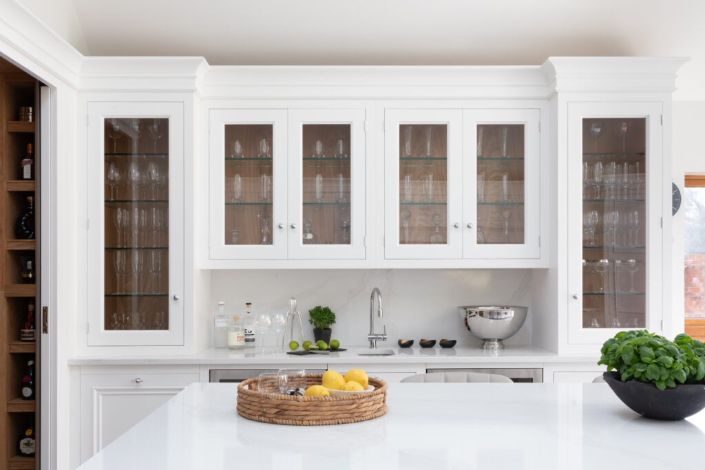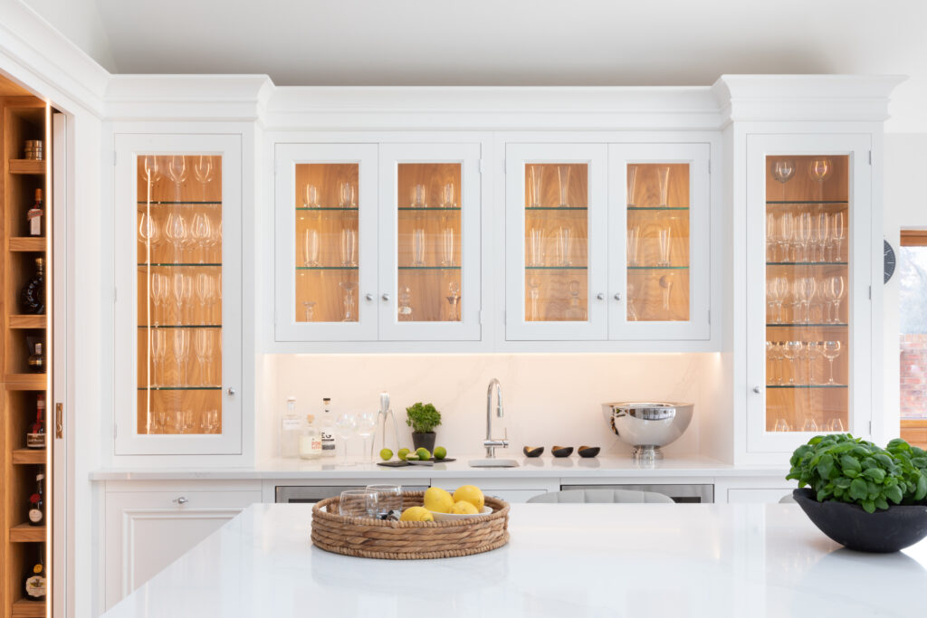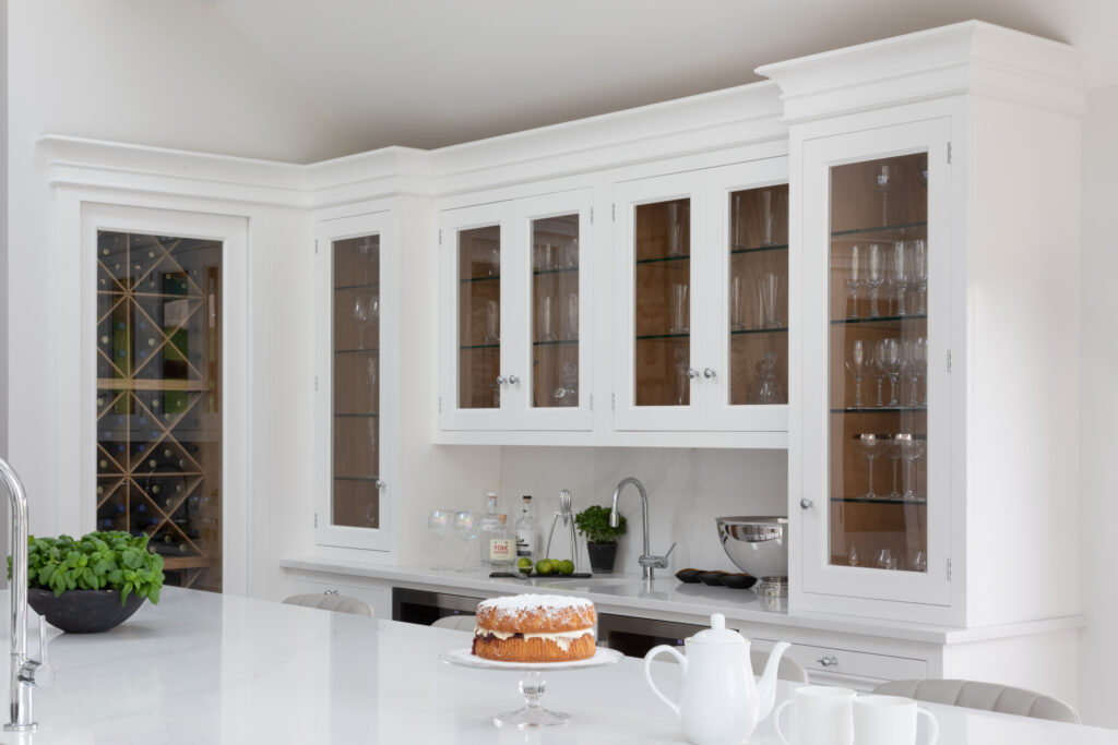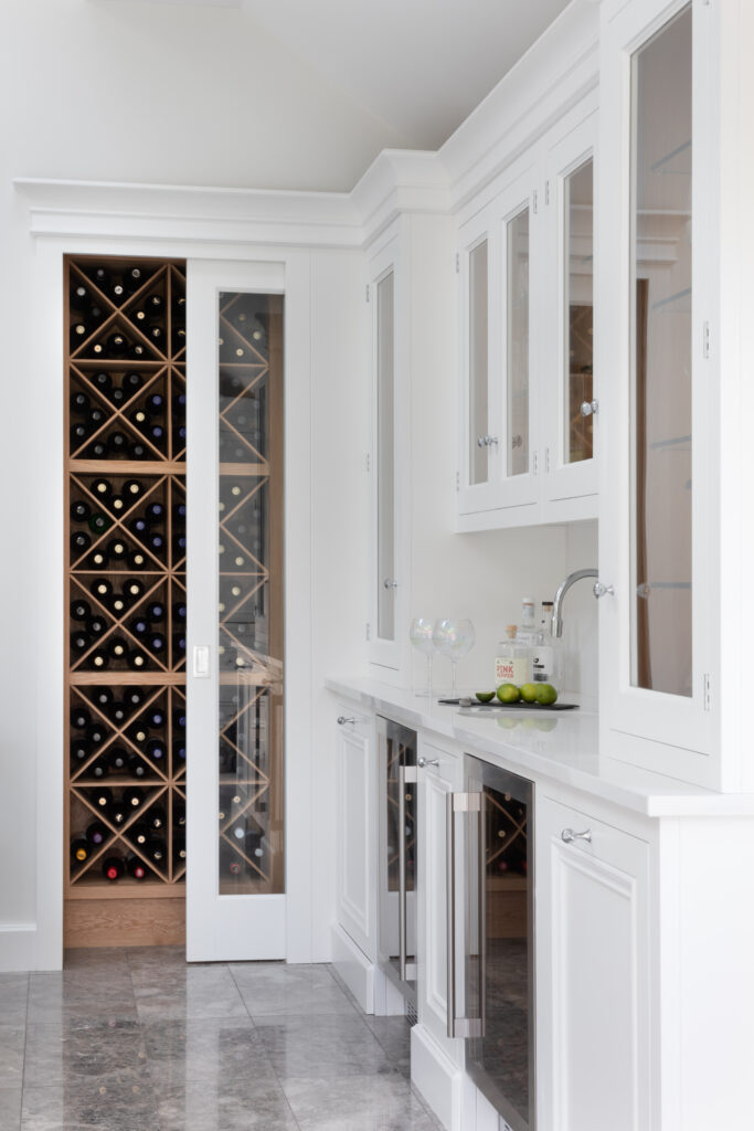 We designed this as a piece of furniture first. The crisp Farrow & Ball – All White cabinetry frames the warm, oak interiors, creating a rich backdrop for the glassware behind the glazed doors. The engineering highlight is the pocket door; it slides effortlessly into the wall to reveal a floor-to-ceiling oak wine feature with integrated diamond lattice storage. With twin under-counter coolers and a dedicated prep sink, it’s a fully self-contained station.