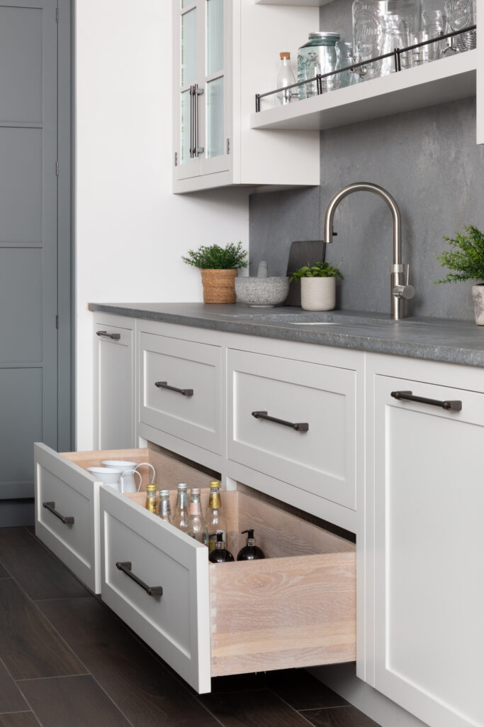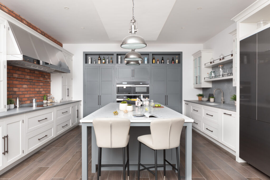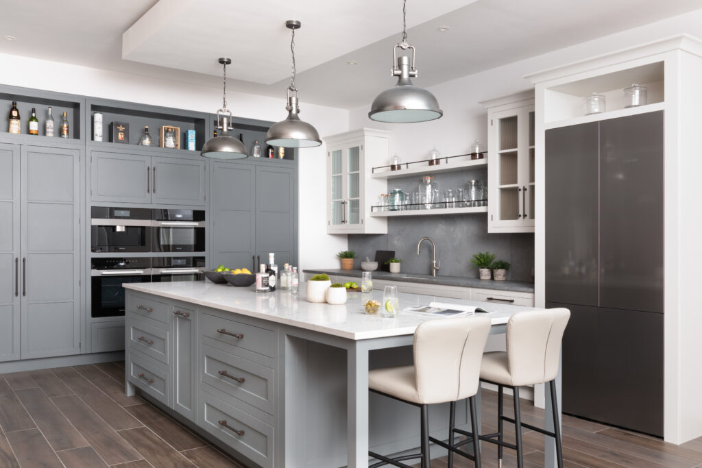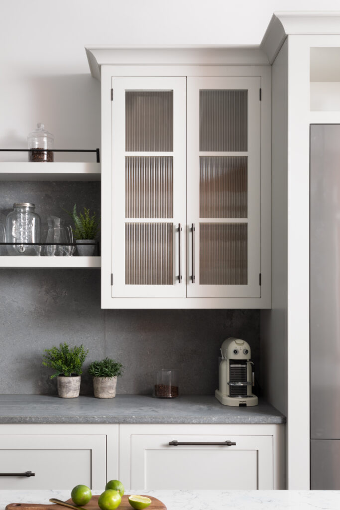 We skipped the polished chrome. Instead, we used industrial bronze bar handles by Armac Martin and concrete Caesarstone worktops. The cabinetry features narrow-framed shaker doors with Crittall-style rails and reeded glass. It looks architectural, but the real benefit is the blur, it disguises the contents, so your cupboards don’t have to be Instagram-perfect inside.