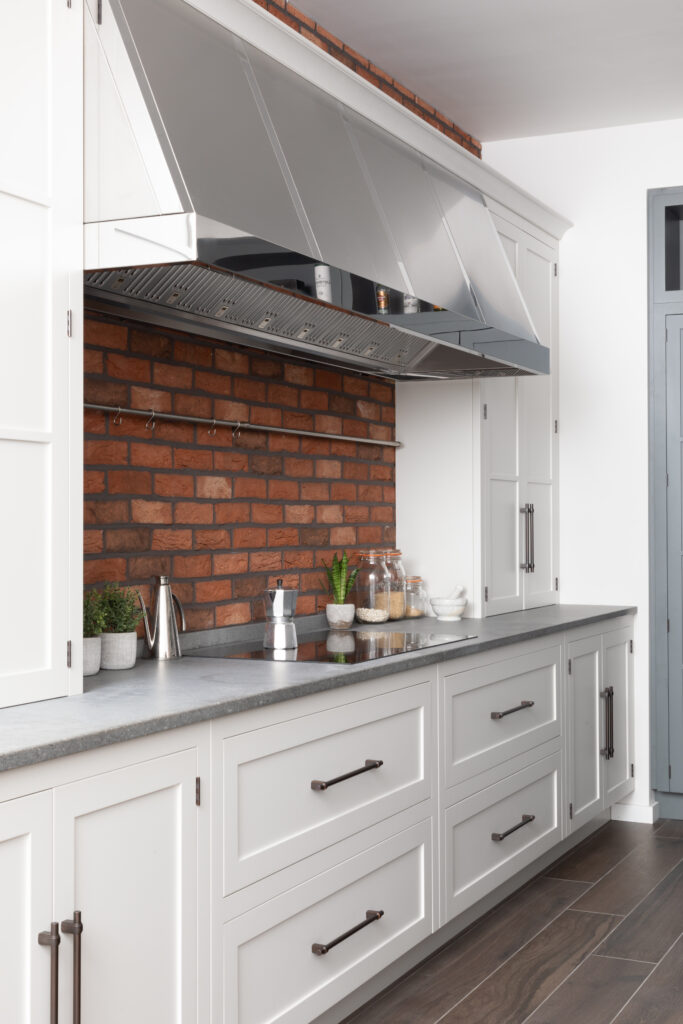 We didn’t try to hide the extraction; we celebrated it. A substantial, stainless-steel Westin canopy hangs over the 900mm Miele induction hob. It sits against raw exposed brick, proving that functional engineering can be beautiful. You won’t get cooking smells lingering in the sofa cushions with this set up.