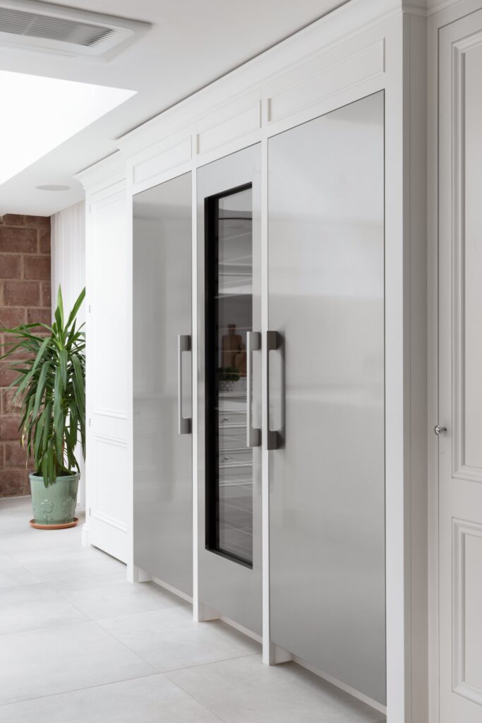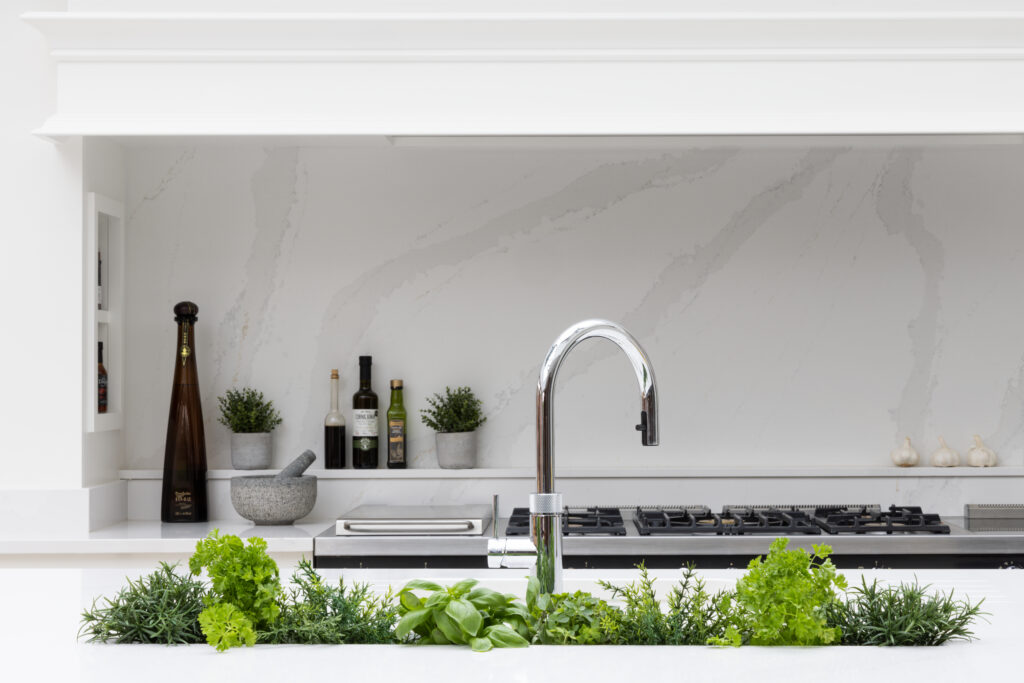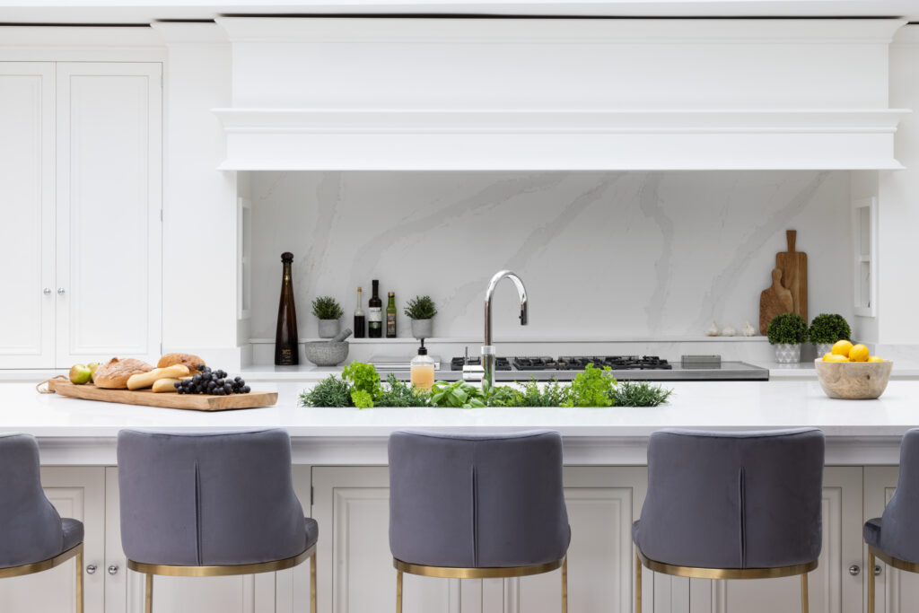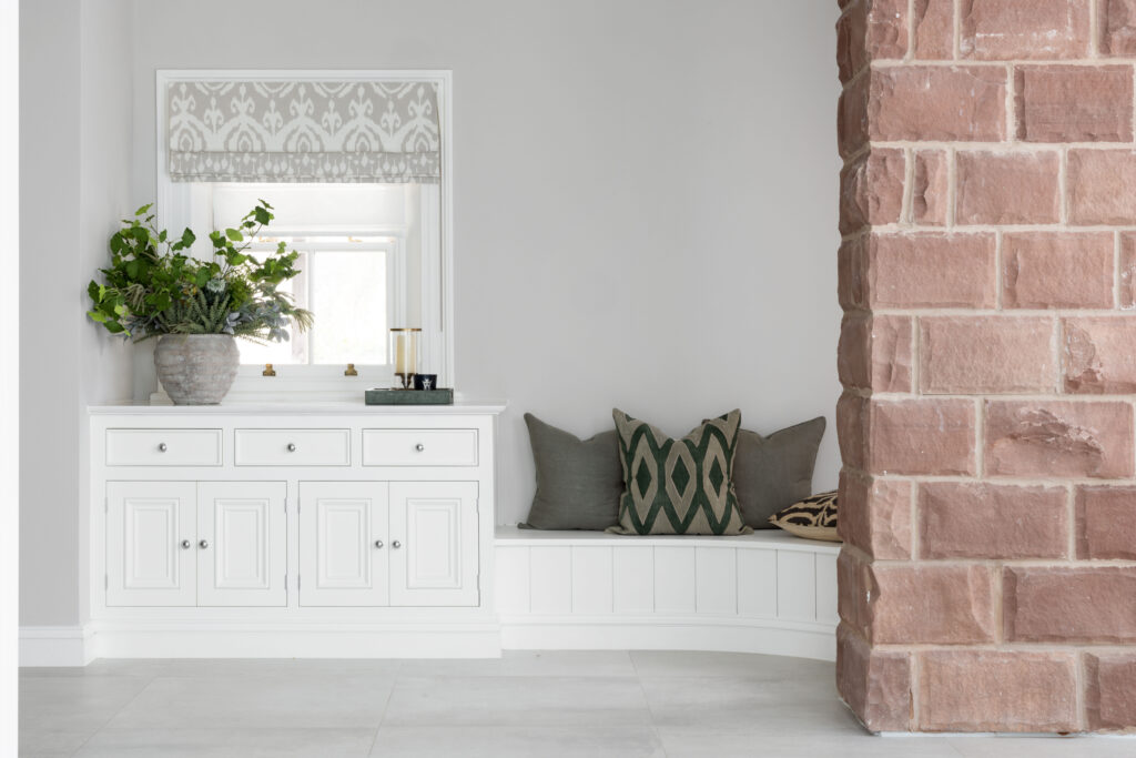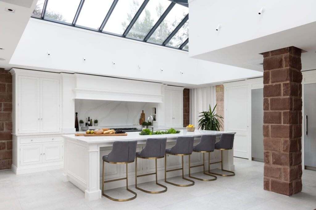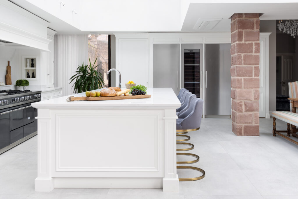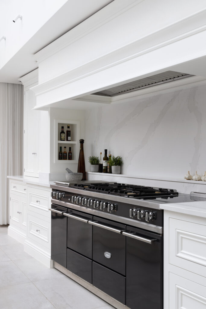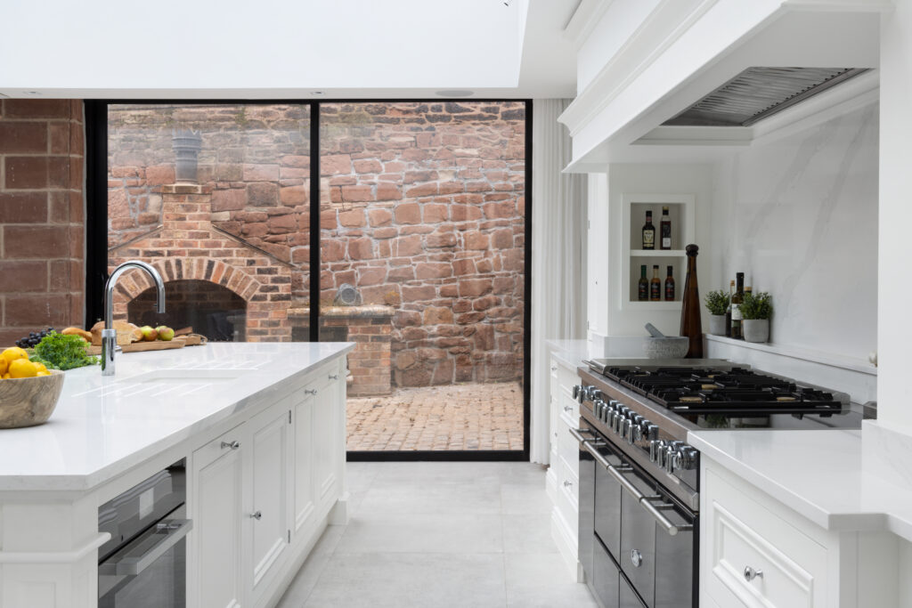 Instead of plastering over the past, we framed it. That incredible exposed sandstone wall became the anchor for the whole design. We placed the 1500mm Lacanche range centrally against it, allowing the crisp, painted joinery to contrast with the rough, historic stone. It instantly warms up the room and stops the space from feeling too “new.”