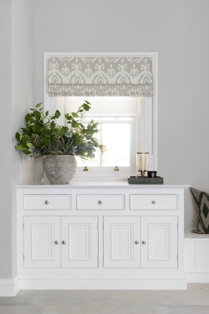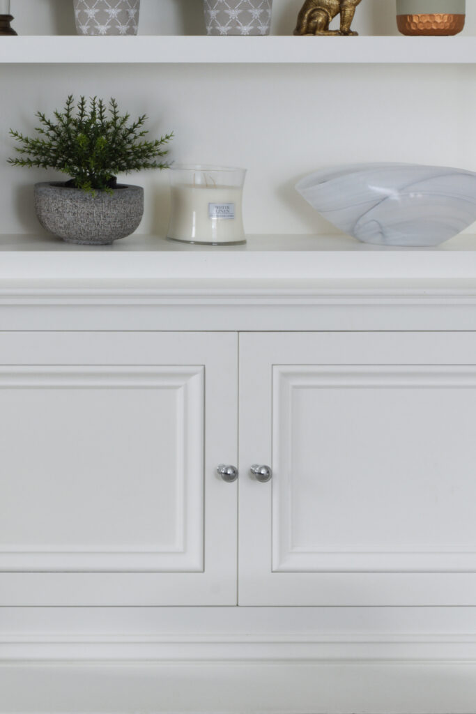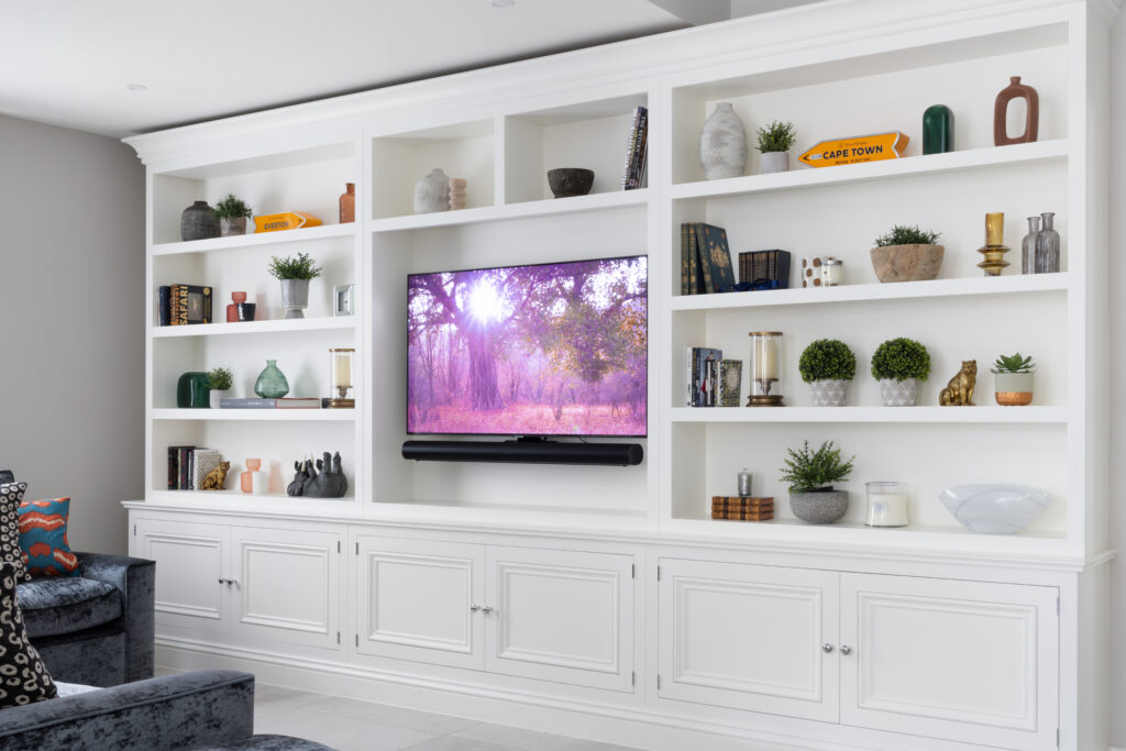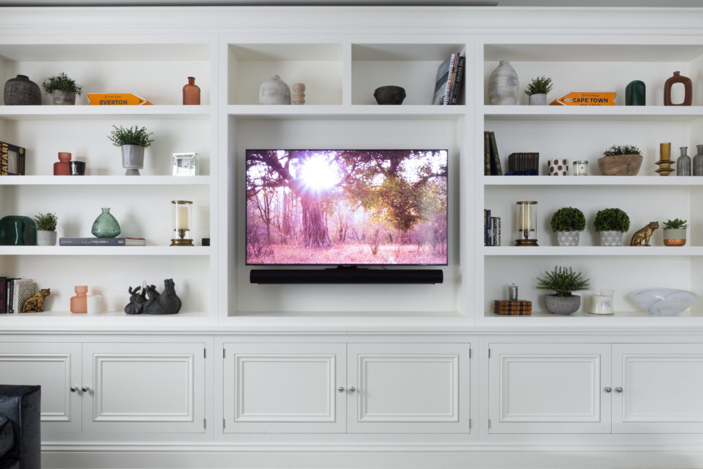 We didn’t stop at the kitchen. The joinery flows into the media snug, featuring a full wall of cabinets that mirrors the kitchen style – The whole ground floor feels like one cohesive space. By combining open shelving for the books and photos and deep closed cupboards to house the router, the remotes, and the clutter – it’s organised and stylish, but it also stops the big black screen from dominating the room.