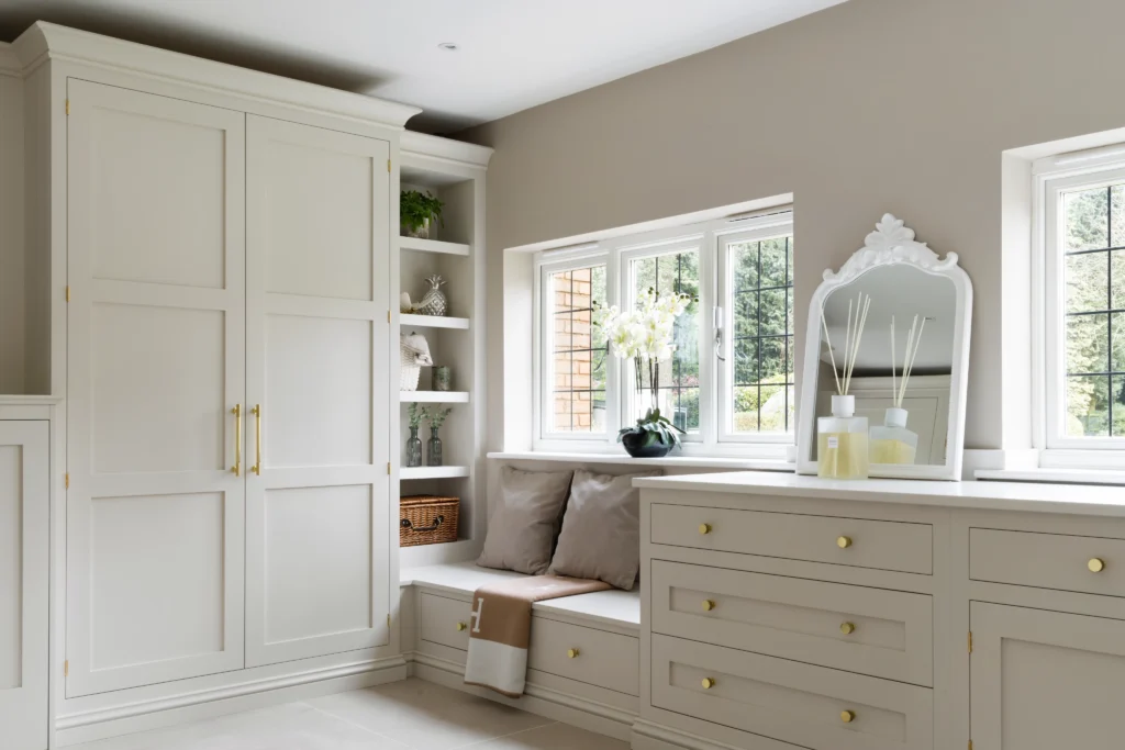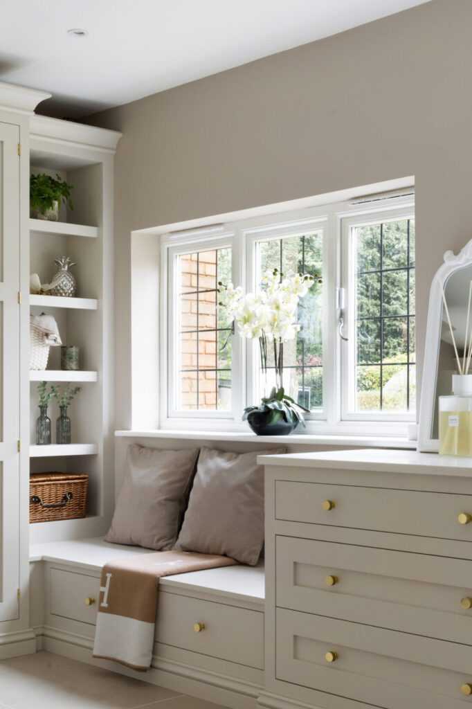 The layout is smart. We used a bespoke corner configuration to blend tall storage with a practical window seat. On the left, floor-to-ceiling cupboards tuck bulky coats and muddy wellies away. The seat is the perfect spot to perch while you put on your boots, and the deep drawers underneath hide the hats and scarves. We finished the cabinetry in Little Greene ‘Joanna’ with brushed gold hardware to keep the aesthetic warm, not utilitarian.